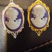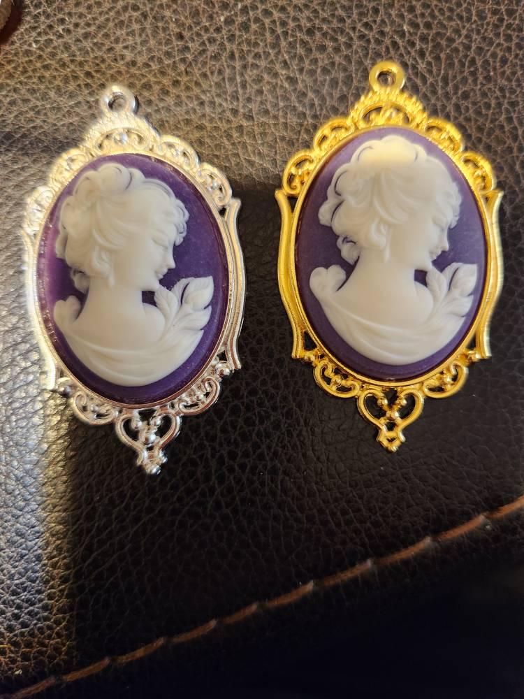 Vintage oval cameos, 2 of the same, White lady in profile on purple size 30 by 40 mm.